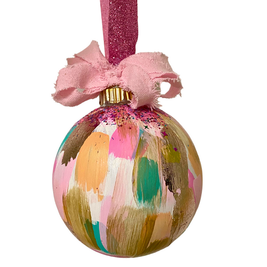 Hand-Painted Glass Christmas Ornament | 3” Blown White Glass with Greenery Design & Velvet Ribbon