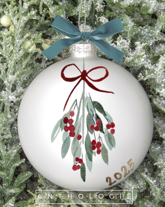 Hand-Painted Glass Christmas Ornament | 3” Blown White Glass with Greenery Design & Velvet Ribbon