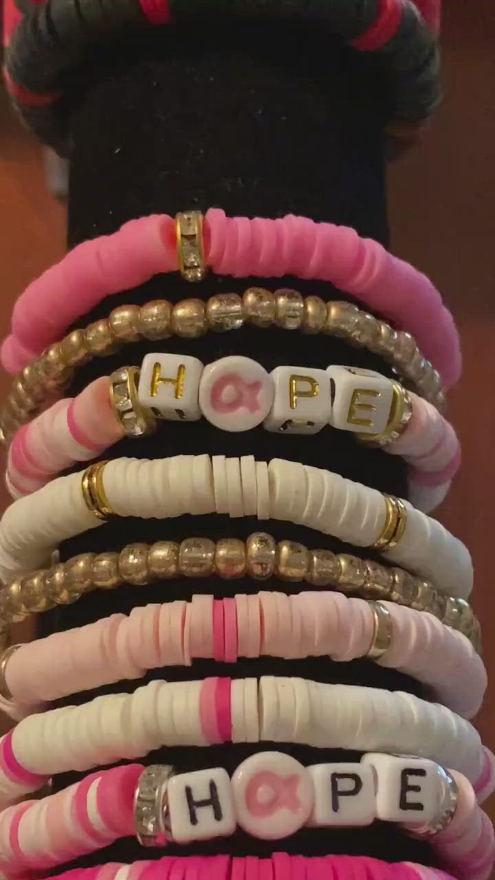 Each beaded bracelet has 6mm vinyl disc (Heishi) beads strung on a 6.5" elastic cord with tie closure. Bracelets include a pink cancer ribbon bead as well as an encouraging word, if you choose.  You are purchasing ONE bracelet. To order a stack or set please contact us for a custom quote.