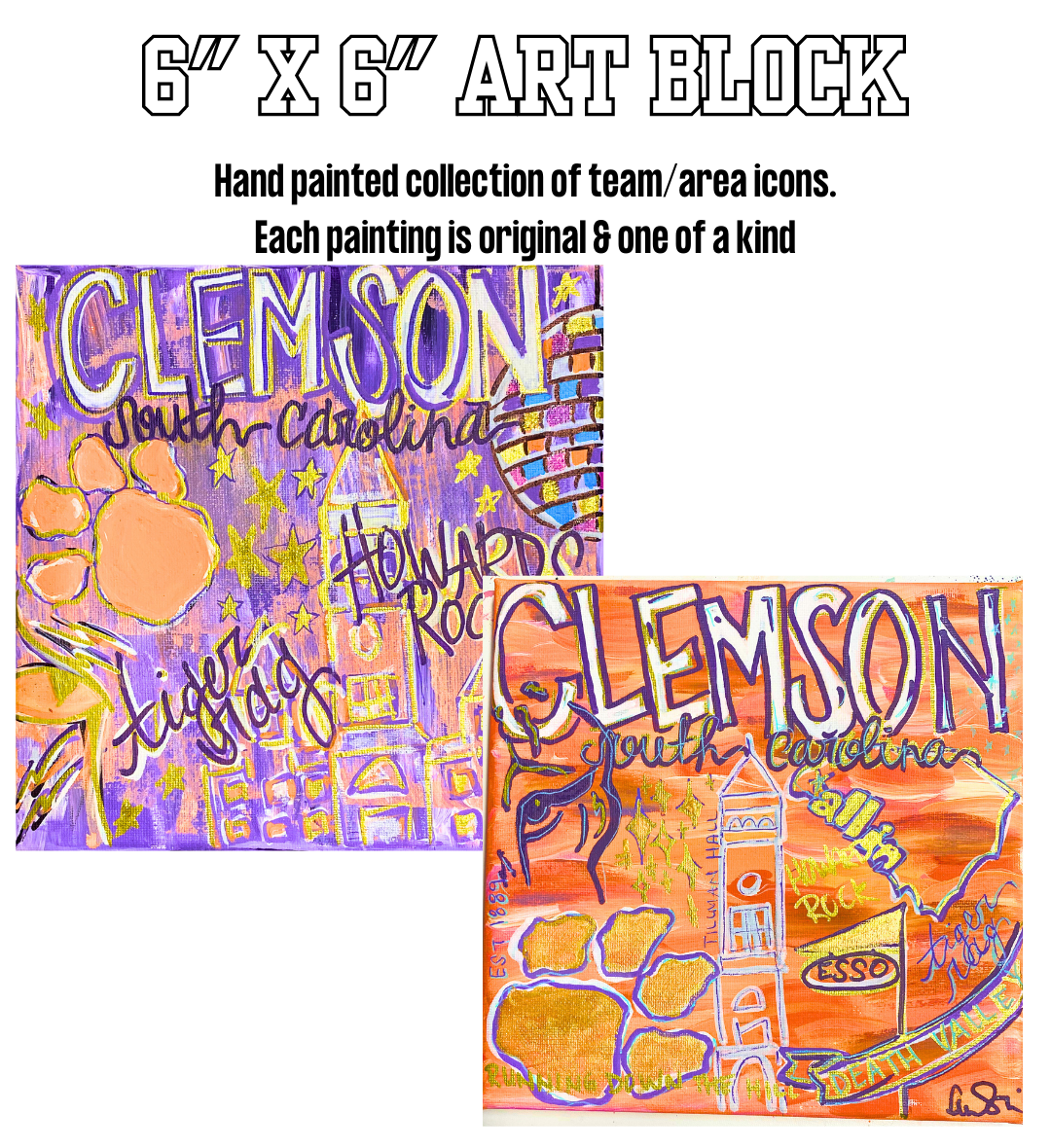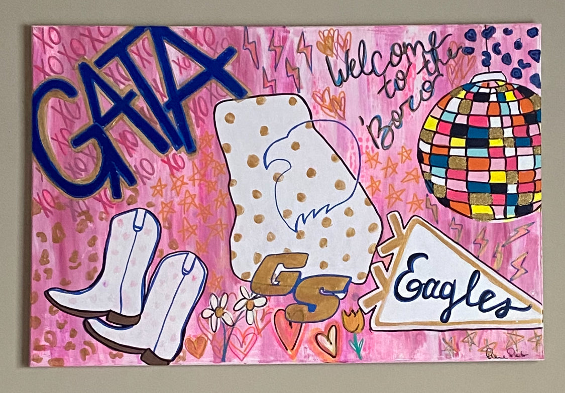 Show off your school pride with our hand painted Team Spirit Artwork! Perfect for dorms, apartments, or classrooms, this unique collage features your school's colors, mascot and more. Let your team spirit shine through with this fun and quirky addition to your decor. Go team!